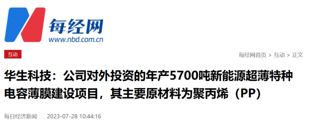 华生科技投资年产5700吨新能源超薄膜:华生科技(605180)7月28日在投资者互动平台表示,公司对外投资的年产5700吨新能源超薄特种电容薄膜建设项目,其主要原材料为聚丙烯(PP),公司订购的设备较为先进,同时也加入了公司的部分设计要求。